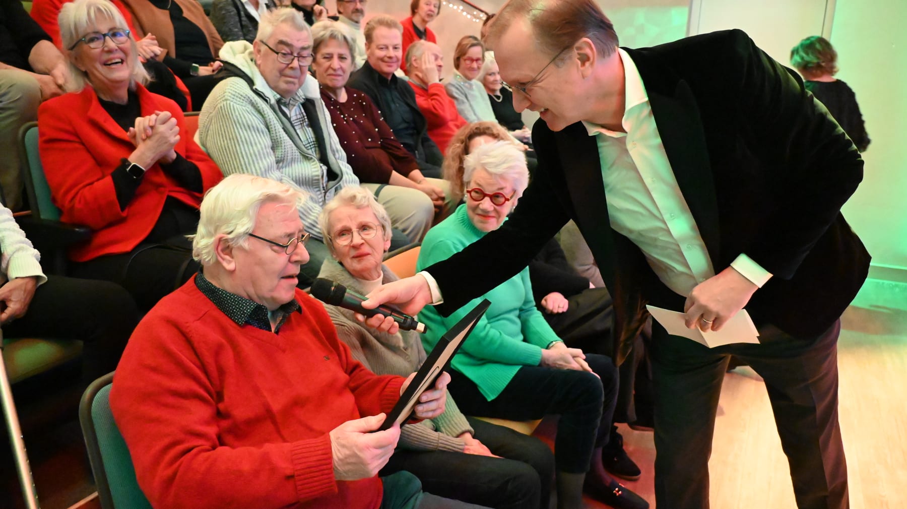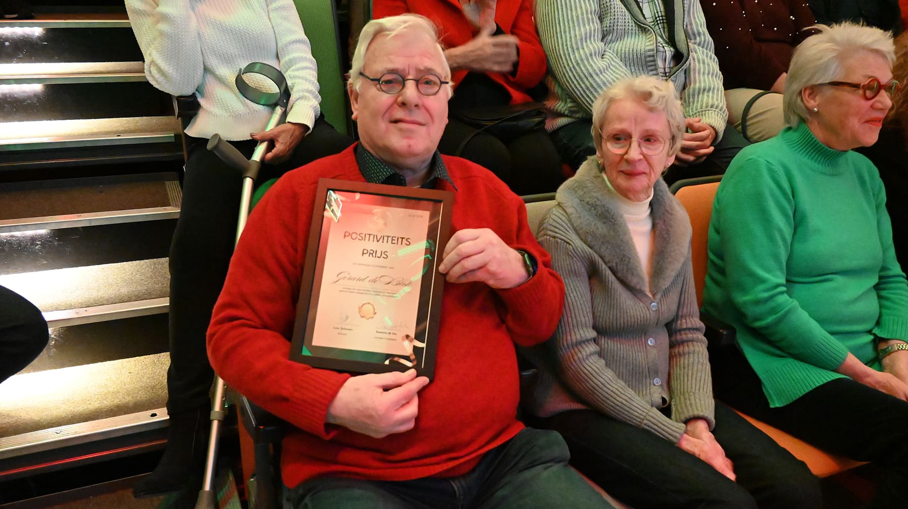 Gerard De Blok kreeg uit handen van Suzanne de Vos de positiviteitsprijs vanwege zijn enorm positieve instelling na een hele lelijke val afgelopen zomer. De revalidatie zal nog maanden duren dus was het extra bijzonder dat Gerard de kerstborrel kon bijwonen met zijn vrouw.