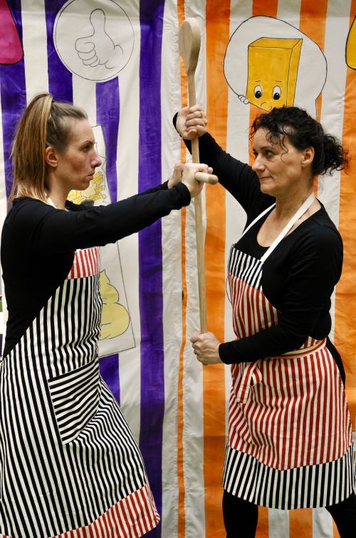 HEEL VEEL PATAT is een komedie voor iedereen vanaf 4 jaar waarbij het publiek helpt bij het zoeken naar een oplossing bij een ruzie.